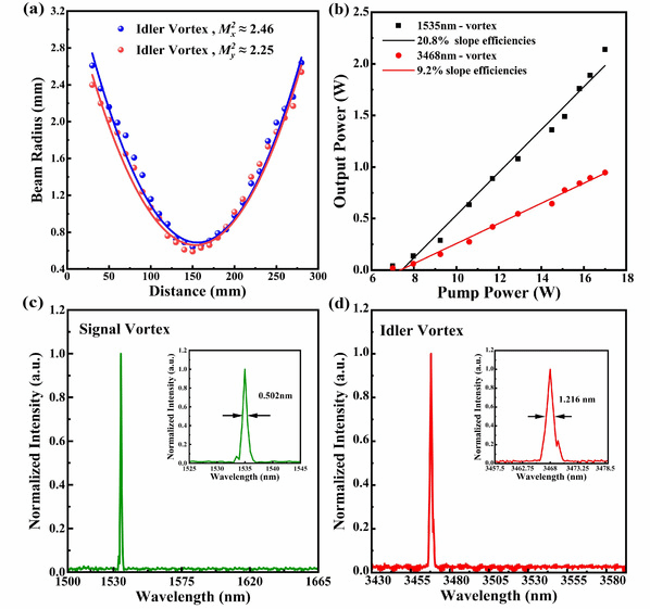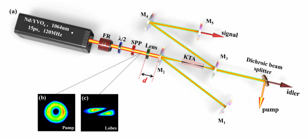 光学漩涡具有环形空间形式,其螺旋波面(以拓扑电荷l为整数)产生轨道角动量(OAM),已在光镊和材料加工等多个研究领域得到广泛研究。对光学漩涡的研究主要集中在近红外和可见光区域,而非线性光学转换过程已被证明是扩展光学漩涡波长的最直接方法。尤其是光学参量振荡器(OPO),它已成为在所有时间尺度上实现从紫外到中红外区域相干辐射的实用方法。