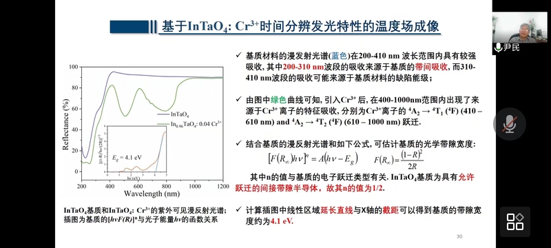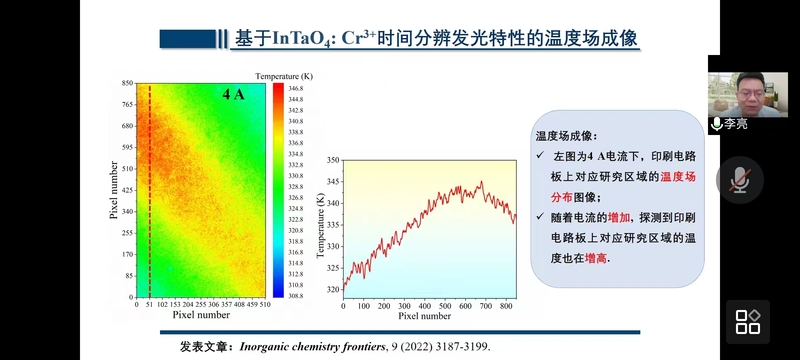 尹民教授任中国稀士学会发光专业委员会副主任、中国物理学会发光分会理事、安徽省物理学会副理事长委等,并入选2000年教育部《跨世纪优秀人才计划》。先后主持973计划课题、国家重点研发计划课题以及多个国家自然科学基金等项目。本次讲座以“基于发光材料的温度探测”为主题,介绍了发光材料技术应用与发展前景,并重点讲解发光材料的荧光强度、荧光强度比、荧光寿命在温度探测等方面的研究成果,对部分荧光物质的温度特性、测温原理、温度场成像等内容进行解释,并倡导大家要多做实践中的研究,少做研究中的实践。报告结束后,尹民教授与师生就发光材料的温度探测材料的技术瓶颈、研究方法以及物理机理等学术问题进行了深入交流讨论,并详细解答了师生提出的相关问题。