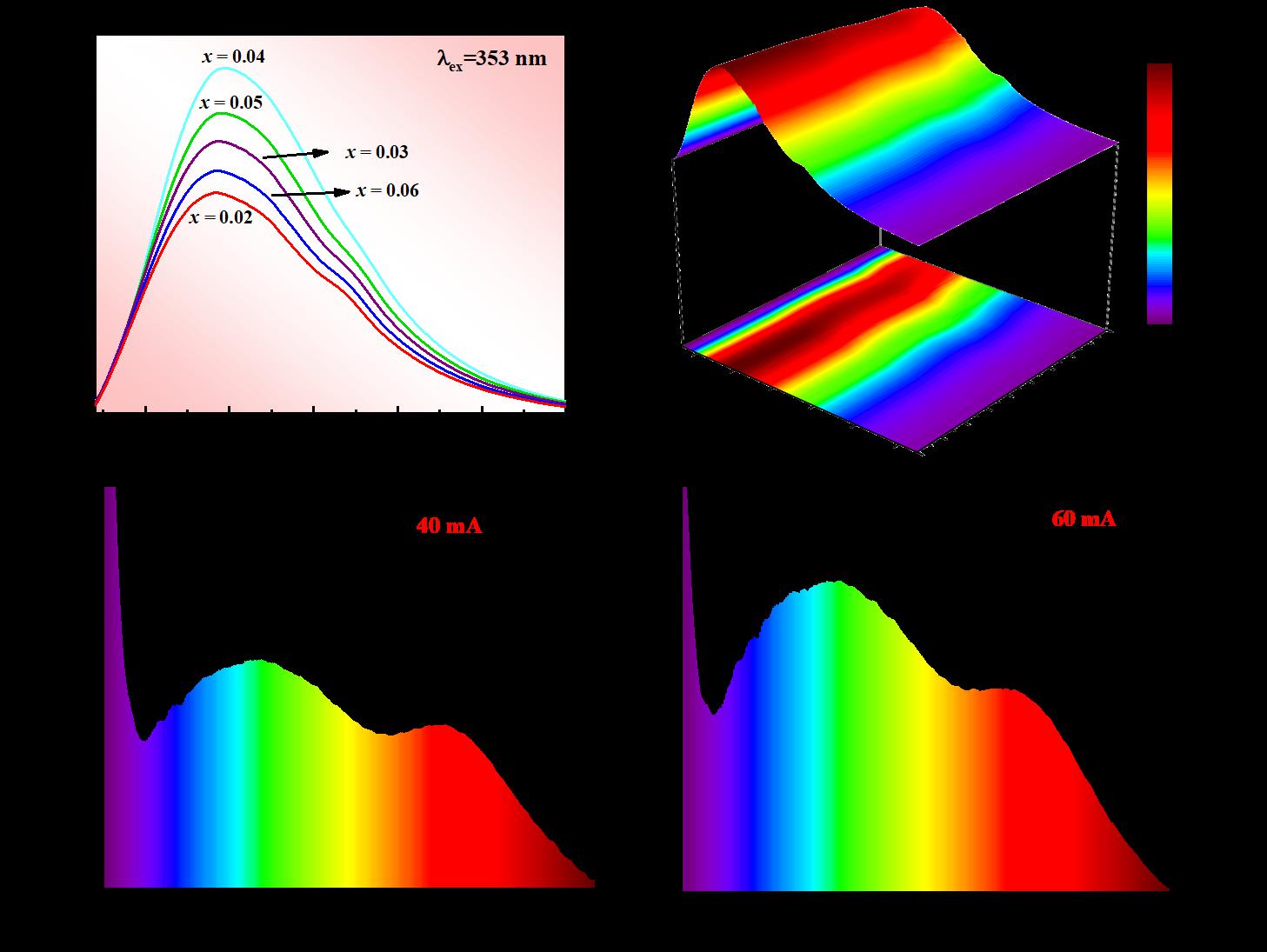 (a)K1-xAlSiO4:xCe3+(x=0.02~0.06)的发射光谱;(b)K0.96AlSiO4:0.04Ce3+的变温光谱;WLED器件在(c)40mA和(d)60mA电流驱动下的EL光谱图