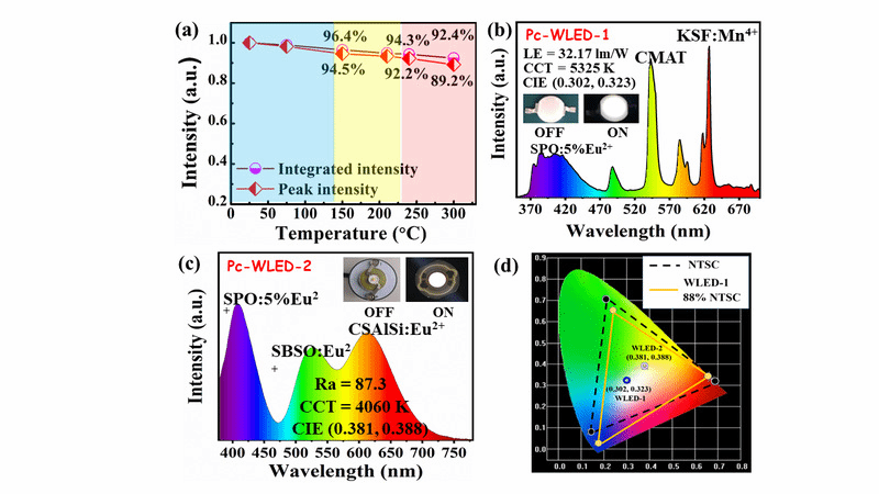 优异发光热稳定性的荧光粉对于高功率荧光粉转换发光二极管极为重要,筛选具有高结构刚性和大带隙的荧光粉基质是获得高热稳定性荧光粉的一种有效策略。我们通过密度泛函理论计算(DFT)发现磷酸盐Sr3(PO4)2化合物同时具有高结构刚性(德拜温度ΘD = 559 K)和大带隙(Eg = 8.313 eV),因此,显示出作为高发光热稳定荧光粉的巨大潜力。实验上,我们成功合成出具有超高热猝灭温度~ 973 ℃的Sr3(PO4)2:Eu2+蓝紫色荧光粉,在150/300℃时,它的发射损耗仅为4%/8%(如图a所示)。通过实验和DFT理论计算相结合,我们证实该优异发光热稳定性得益于无辐射跃迁限制和热诱导发射补偿的协同效应。利用所制备的Sr3(PO4)2:5%Eu2+蓝紫色荧光粉探索了其白光LED照明和宽色域显示领域的应用(如图b-d所示)。本工作为开发高热稳定性的荧光粉提供了设计思路和深入见解。
