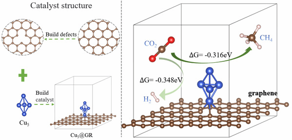 本研究聚焦于开发高效电催化还原CO₂的纳米催化剂,通过密度泛函理论(DFT)计算,系统探究了缺陷石墨烯负载的铜团簇(Cu₅@GR和Cu₆@GR)在CO₂还原反应(CO₂RR)中的催化性能,揭示了Cu₅@GR和Cu₆@GR的高效催化机制,为实验设计提供理论依据,其中Cu₅@GR表现出更低的过电势和更高的CH₄选择性,优于同类催化剂。缺陷石墨烯负载铜团簇的策略为开发低成本、高稳定性的CO₂RR催化剂提供了新思路,助力碳中和目标实现。