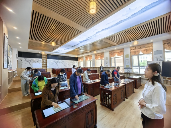 随后,全体党员教师在基地师生的引导讲解下,先后参观了“习近平新时代党的民族工作思想学习区”及“共拓疆域”“共书历史”“共创文化”“共育精神”五大区域。通过视频、图片、文字,学习了解西域与中原地区多角度密切互动的历史史实,感受声光电等高科技手段为大家生动展示的各族群众共同建设中华家园的历史记忆。同时,党员们还体验了美育中心书法室、茶艺室、棋艺室、剪纸文化室、陶艺室等美育课堂功能室,感受到美育中心在传播中华民族传统文化、弘扬红色文化等方面的特色创新理念,感受了中华优秀传统文化的深厚底蕴和独特魅力。