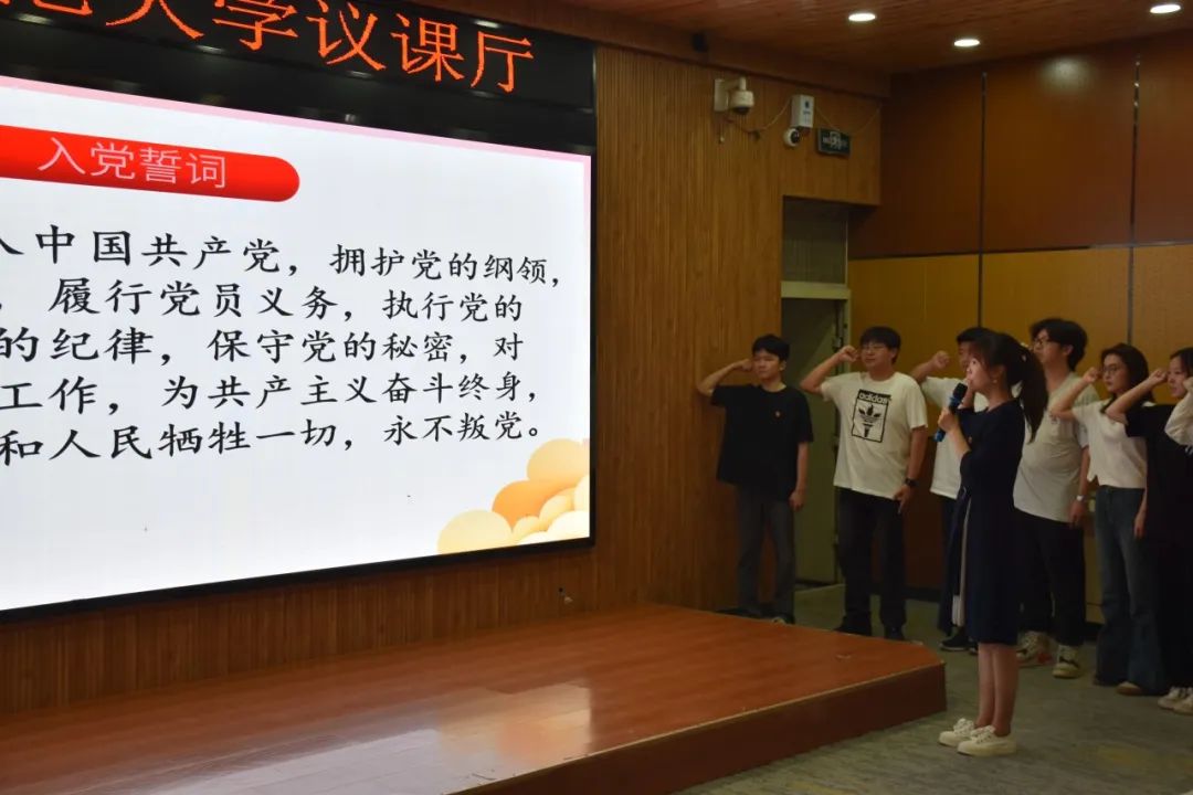 活动中,首先由党委书记李莉同志领学了《习近平在全国科技大会、国家科学技术奖励大会、两院院士大会上的讲话》。接着,在党委副书记、院长向梅同志组织下,为今年上半年新发展的8名学生党员佩戴了党员党徽,举行了入党宣誓仪式,并重温了入党誓词。103年初心不改,103年矢志不渝。本科生第一党支部李佳歧、本科生第二党支部李永琴同志作为新发展党员代表做了发言。随后,全体党员在研究生党员杨天奇同志的带领下一起学唱了红色革命歌曲《唱支山歌给党听》。该歌曲表达了对党的伟大力量的切身感受、对革命无比忠诚的内心表白。通过歌唱,让广大党员回忆了激情燃烧的岁月,抒发了浓浓的爱国爱党情怀。最后,全体党员一起制作了创意手工为庆祝党的生日献上最诚挚的祝福。