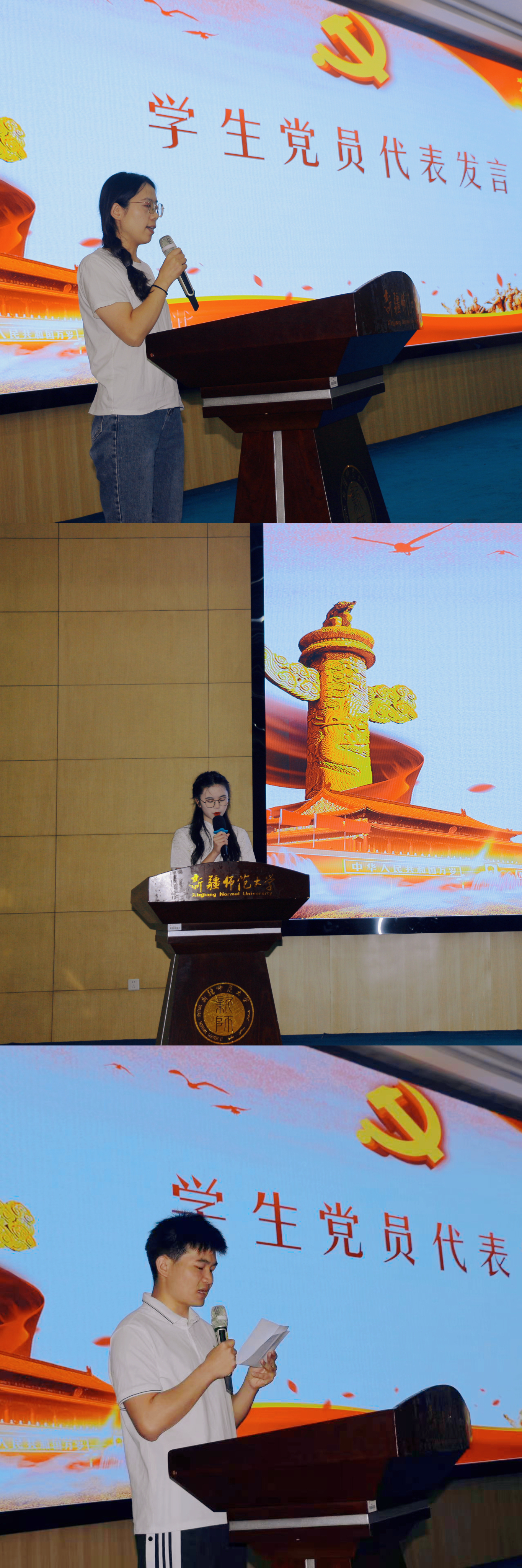 研究生党支部毕业生党员周玉霞、本科生第一党支部毕业生党员陈钰梅作为党员代表进行了发言。她们表示,会牢记自己身上所肩负的责任和使命,时常以党章对照自己、激励自己、反省自己,做遵纪守法、积极向上的新时代好青年。号召大家从平凡岗位做起,秉持不惧平凡的心,在日复一日的坚守中化平凡为不平凡。本科生第二党支部毕业生党员吴梦梦代表退役大学生党员发言,他表示未来会继续为党和国家贡献自己的力量,以耐心、勇气、意志和迎难而上的精神,不断提升自我。接着,举行了党员宿舍和退伍大学生宿舍的授牌仪式,由毕业党员将宿舍牌接力传递给新发展党员宿舍,希望他们传承好的作风,继续在学生群体中发挥共产党员的先锋模范作用。