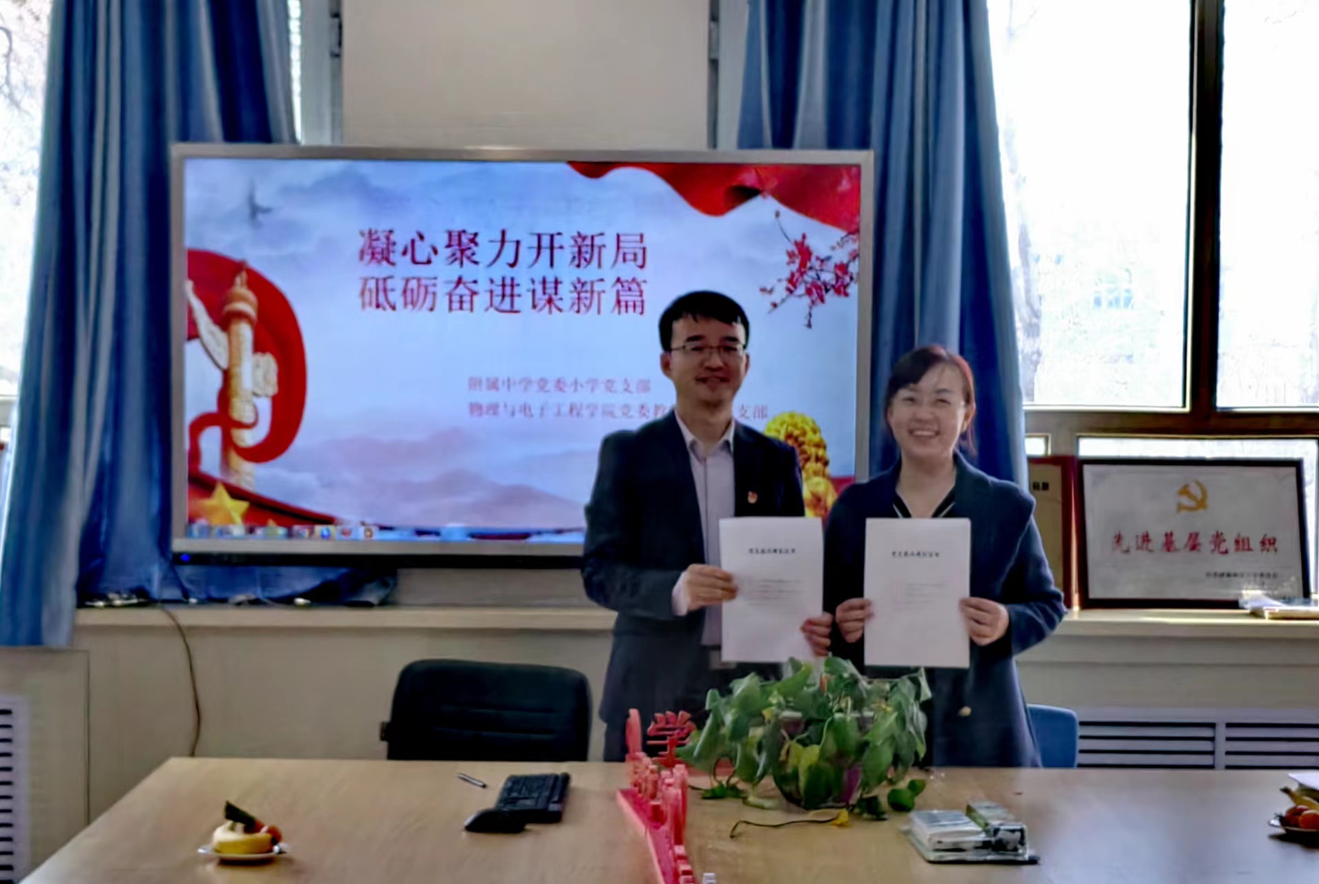参观结束后,两个党支部的党员教师在附属中学党建活动室举行了党支部共建启动仪式。附属中学小学党支部书记王新刚和物理与电子工程学院教师第一党支部书记秦晨代表双方签订了“科普活动进校园”支部共建协议书,商定未来将以“党建引领悟物明理春风化雨”为主题持续开展丰富多彩的共建活动。王新刚老师讲到,附属中学在小学科学课程和学科教师的专业性建设方面需要进一步加强和深化,希望以此共建活动为契机,借助大学教师的力量,为小学任课教师在实验学科的专业化引领、多学科融合思路的扩展和小学生科学素养提升方面提供更多的支持和帮助。秦晨老师表示,党支部将依托“三人行”党小组,针对小学课后托管和第二课堂的需求,充分发挥专家博士团队的优势和力量,通过定期开展科普活动,激发小学生热爱科学、学好科学的兴趣和热情,为培养科学精神和创新能力、引导确立价值航向与精神坐标提供一定的支持和指导,做好小学科学教育加法。