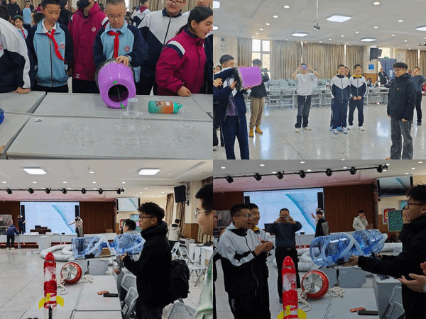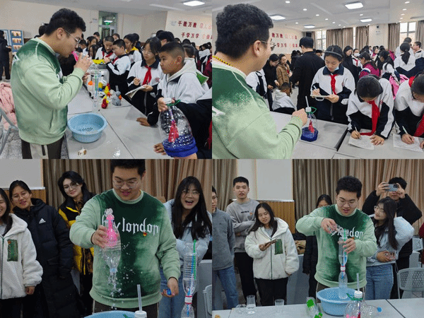 活动伊始,在附属中学第九届校园科技节开幕式后,支部党员设计的“水火箭”、“神奇喷泉”、“空气动力”、“真空束缚”和“双维息动”五项趣味物理实验瞬间吸引了师大附中同学们热情的簇拥围观,党员们通过“科技展示+互动体验+原理讲解”,为附中的师生呈现了一场充满想象力与创造力的科技盛宴。在等离子炮中电弧击穿空气的瞬间,在水火箭猛然升空的瞬间,在马德堡半球被拉开的瞬间,在瓶子里的水从瓶口喷涌如注的瞬间,学生们的惊呼和鼓励让参与活动的同学再次深刻理解了科普教育的价值。
