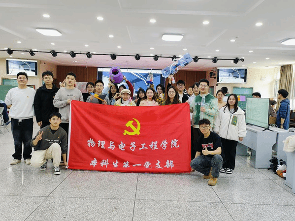 实验演示过后,全体党员在党支部书记赵海琴的带领下面向党旗重温了入党誓词,接力诵读了《中国共产党党员教育管理工作条例》内容,激励全体党员不忘初心、砥砺前行。在最后的交流环节,物理学22-4班发展对象高艺鸣说:真正蹲下身来与附中的同学们对话,不仅是在解释“水流为什么会喷涌”、“火火箭为什么会升空”,更是在回答“中国需要怎样的接班人”、“科技发展对中国的重要意义”。物理学23-1班入党积极分子蒋冰焱说:通过参加这次支部活动,让我明白了只有当科学启蒙与理想信念同频共振时,只有当理论知识和实地教学紧密结合时,才能深刻理解科技强国的宏伟目标并奋勇前进。
