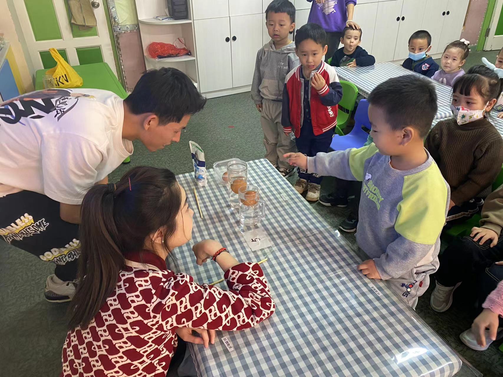 正式党员和一名入党申请人。在本期活动中,他们为幼儿园小朋友带去是:“静电章鱼”和“沉浮的鸡蛋”。