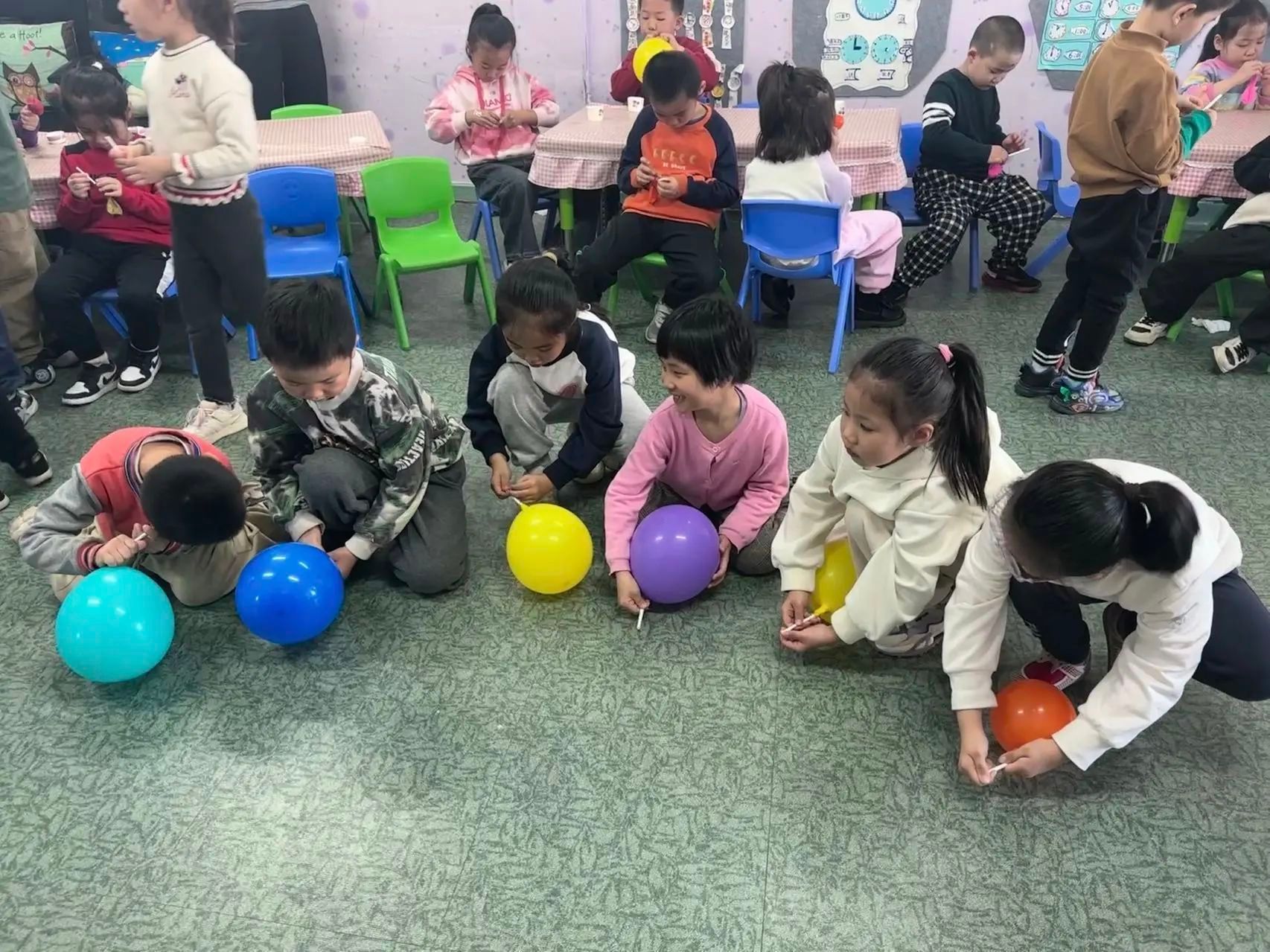 小朋友们做“气球小车转圈圈”实验