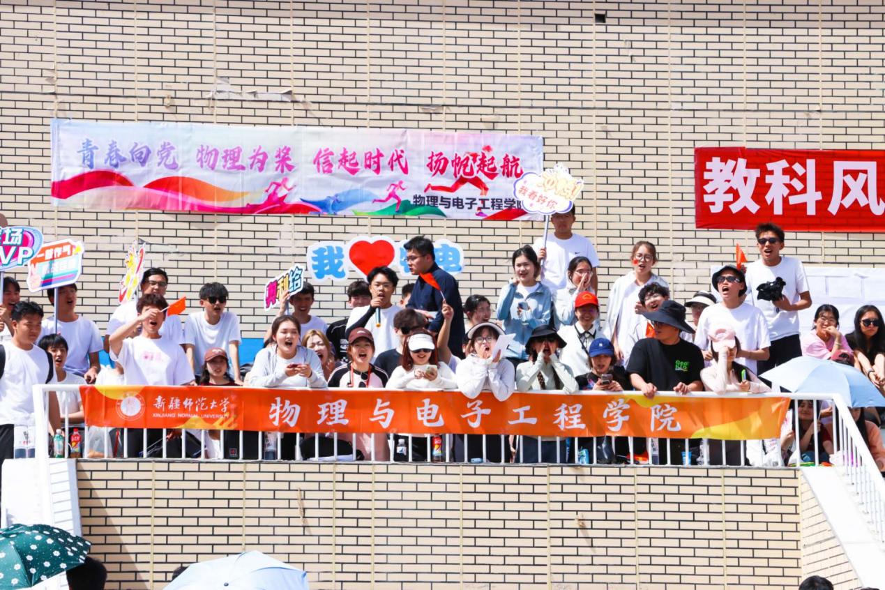 物电学子自信满满,热情高涨,步伐整齐,精神饱满。在中国航天火箭模型的映衬下,学生们纷纷挥舞着手中的扇子,仿佛是在演绎着熊熊燃烧的火焰。这一幕象征着他们如同火箭一般,勇往直前,充满了青春的活力与激情。