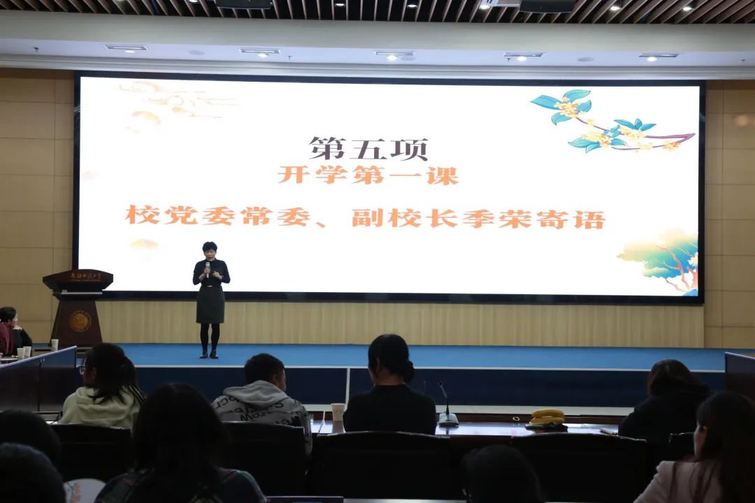 季荣副校长在活动中向2023级新生讲授了“开学第一课”并深情寄语。她结合自身的从教经历,希望同学们要学会自律、自爱和自省,以积极的心态和健康的习惯规划好自己的学业和生活,珍惜美好的大学时光,不负韶华不负心,不负青春不负梦,勇敢担起国家的希望,扛起民族的未来。同时祝愿老师和同学们双节快乐,度过一个安全健康而富有意义的假期。