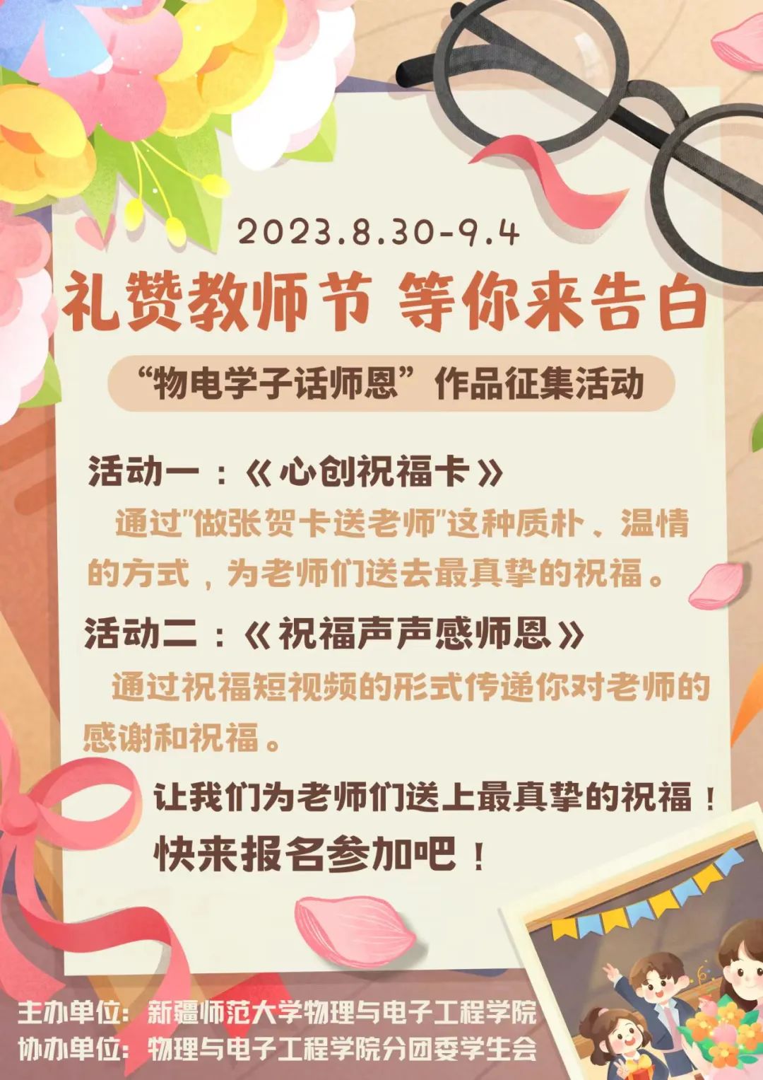 形式二:为全体老师们录制一个60秒以内的祝福视频(横屏拍摄),内容不限,要求积极、向上、温暖,传递正能量。(集体或个人均可)