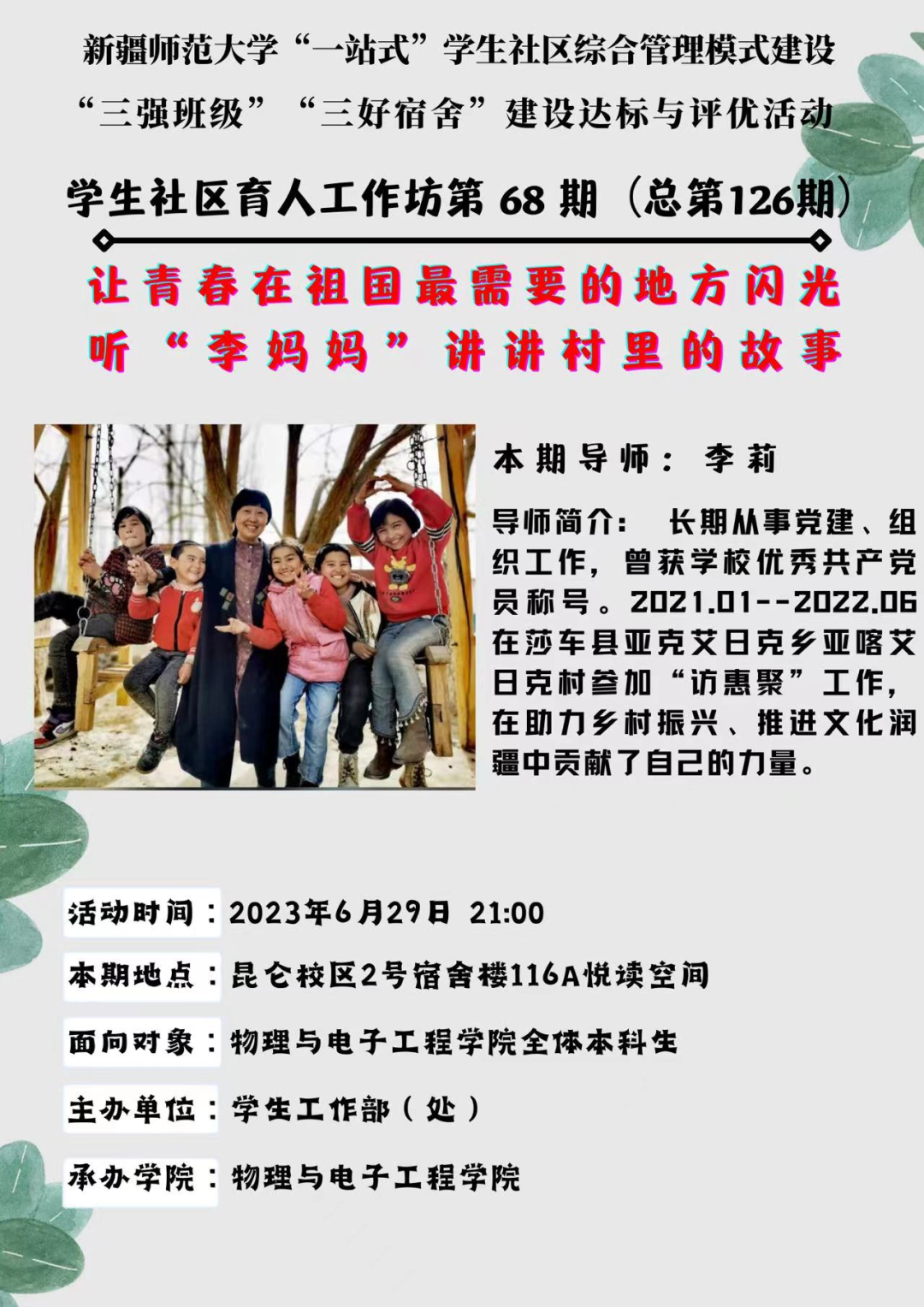 为扎实开展学习贯彻习近平新时代中国特色社会主义思想主题教育,深入贯彻党的二十大精神,进一步加强“一站式”学生社区建设,落实“三强班级”“三好宿舍”建设达标与评优活动,发挥学生社区思想引领、文化润育、学业指导的作用,进一步将学生社区打造为“三全育人”“五育并举”实践园地、文化浸润样板高地及促进学生思想成长、专业提升、价值观培养的重要阵地,结合“三进两联一交友”活动,营造过节氛围,缓解学生复习备考压力,了解学生近期思想动态,william威廉中文官网于6月29日晚在昆仑校区2号楼116A悦读空间开展学生社区育人工作坊活动,本期活动由我院党委书记李莉老师主讲,党委副书记买星老师主持,学工办主任徐丽屏老师、辅导员刘东升老师及“三进两联一交友”同学共同参与。