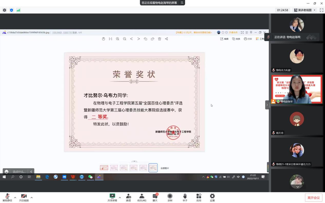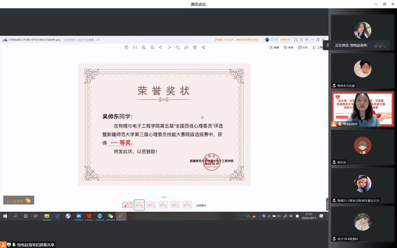 为进一步加强我院各班级心理委员的角色意识,提升心理委员工作素养与能力,促进我院心理委员更好地发挥自助、互助、助人的积极性和主动性,我院于10月11日晚20:00点在腾讯会议线上举办了全国第五届“全国百佳心理委员”评选暨WilliamHill中文官方网站第三届心理委员技能大赛院级选拔赛,全院各班级心理委员参会观摩交流。我院学工办全体老师、2021年“1+3”辅导员杨天奇老师、2022年推免“1+3”辅导员郑叶作为评委出席会议,比赛由我院心理辅导专干赵海琴老师主持。