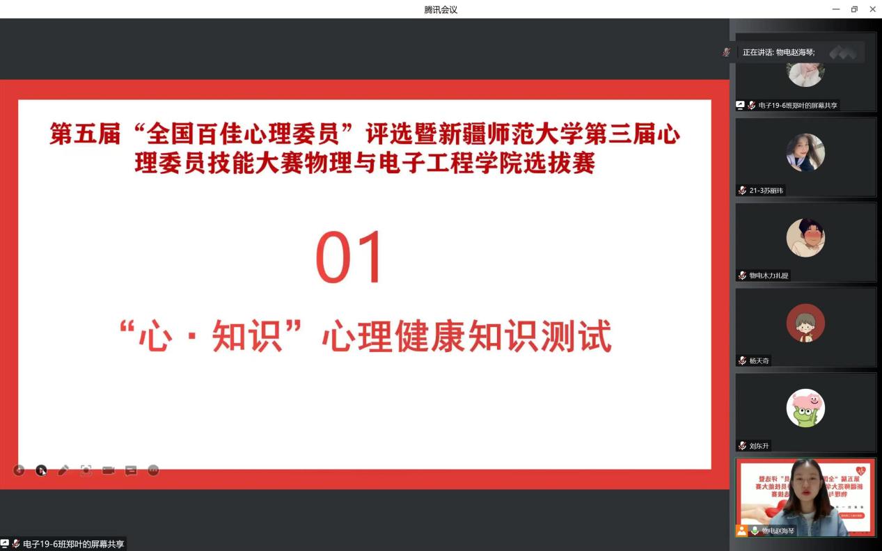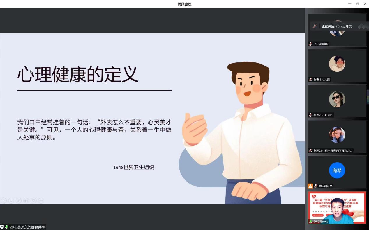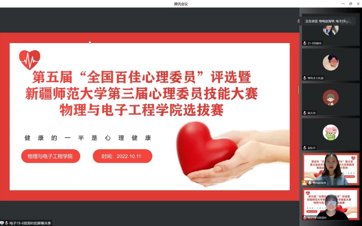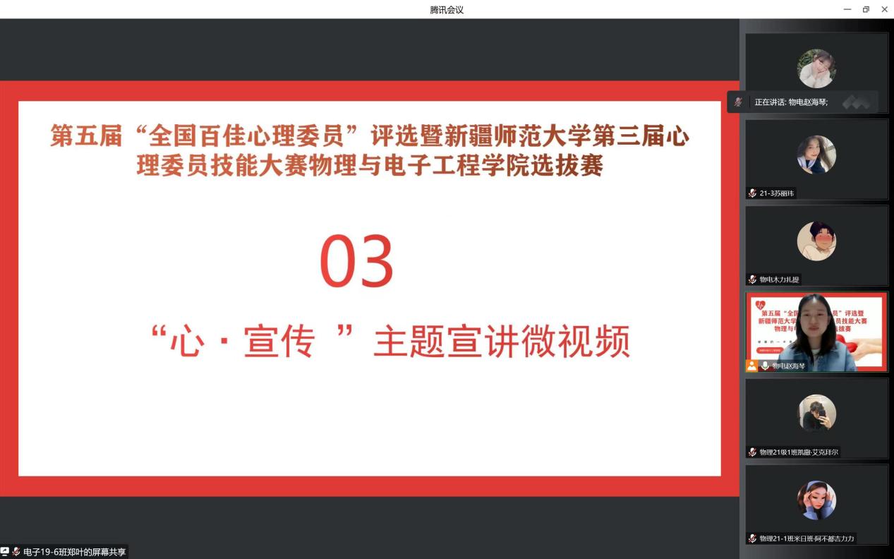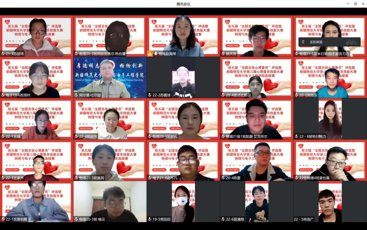 在比赛中,经过“心·知识”心理健康知识问答,选手逐个展示自己设计的“心·遇见”主题班会方案和“心·宣传”主题宣讲微视频等环节激烈的角逐,最终物理20-2班吴帅东同学和物理21-1班凯撒尔·艾克拜尔同学获得一等奖,物理21-1班米日班·阿不都吉力力同学、物理20-4班才比努尔·乌布力同学、物理20-1班丽扎·努尔沙地克同学获得二等奖。