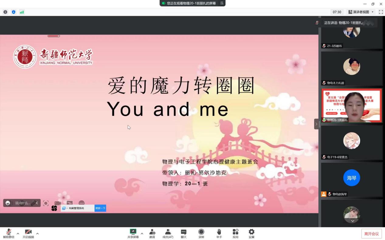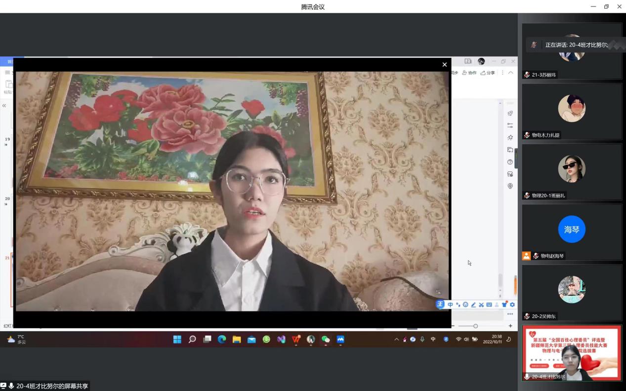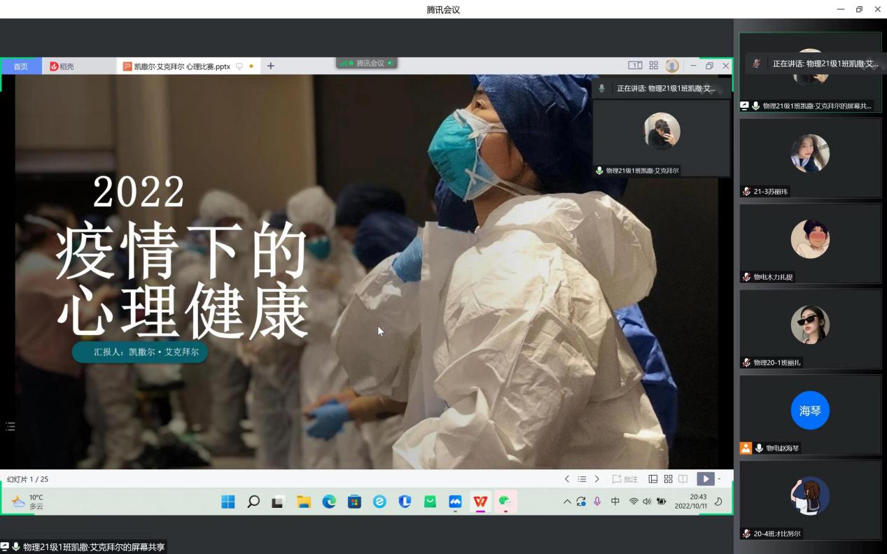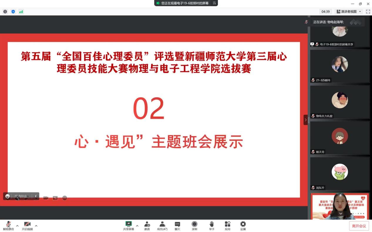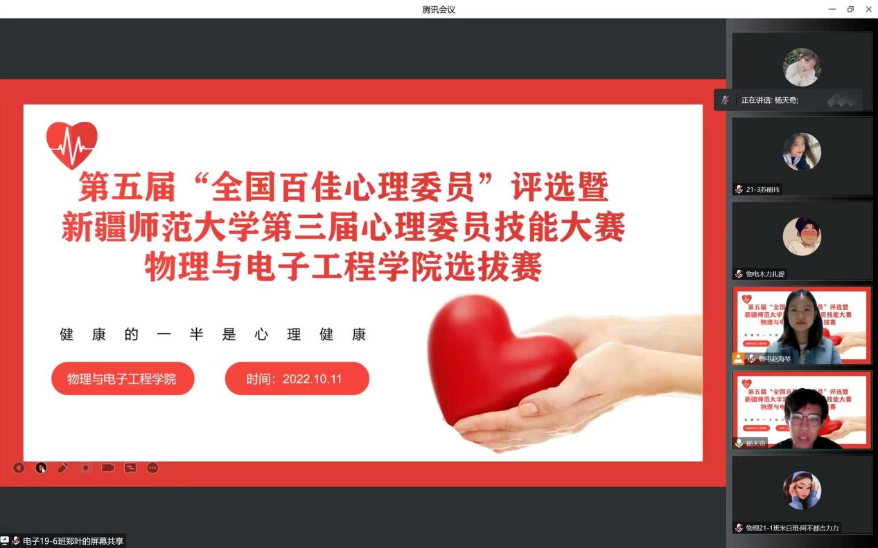在比赛中,经过“心·知识”心理健康知识问答,选手逐个展示自己设计的“心·遇见”主题班会方案和“心·宣传”主题宣讲微视频等环节激烈的角逐,最终物理20-2班吴帅东同学和物理21-1班凯撒尔·艾克拜尔同学获得一等奖,物理21-1班米日班·阿不都吉力力同学、物理20-4班才比努尔·乌布力同学、物理20-1班丽扎·努尔沙地克同学获得二等奖。