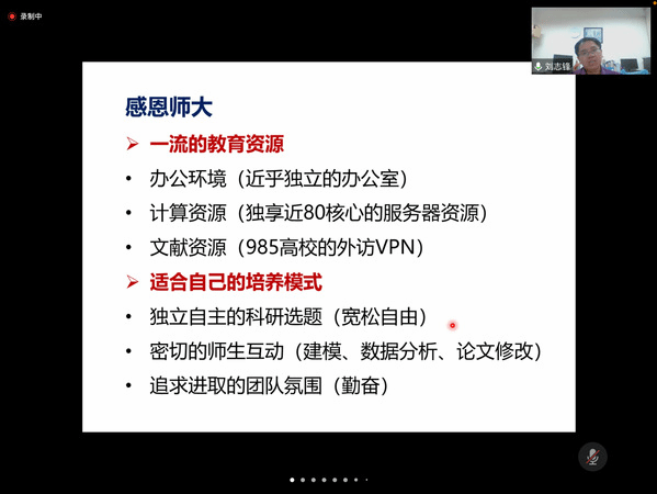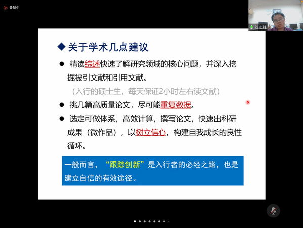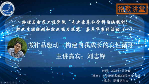 为提升学科内涵建设,加强学生专业素养养成,坚定学生的科研信心,同时鼓励本硕学生做好职业生涯规划,激发同学们的学习热情,助力同学们卓越成长。william威廉中文官网于2022年4月29日晚20:00特邀内蒙古大学物理科学与技术学院教授,研究生导师刘志锋教授回访母校交流,带来主题为“微作品驱动-构建自我成长的良性循环”线上精彩讲座,学院老师、全体研究生和本科生积极参加,本次活动由院研究生会承办,副院长戴鹏鹏主持。