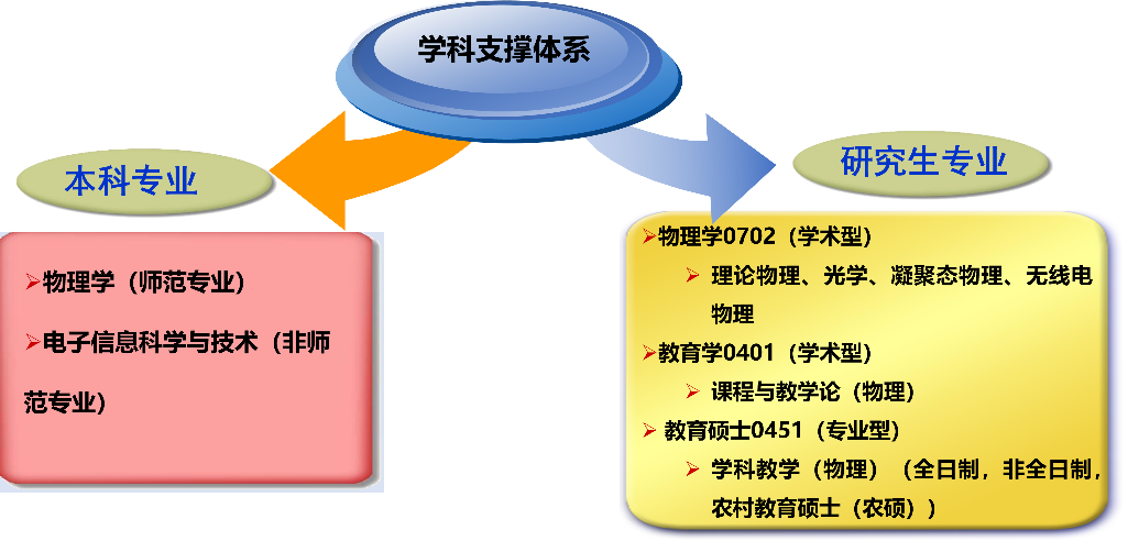 WilliamHill中文官方网站学科门类齐全,学院现有物理系、电子信息科学与技术系和本科实验教学中心等3个教学系室,设有物理学(师范专业)、电子信息科学与技术(非师范专业)两个本科专业。物理学一级学科硕士学位授权点1个,理论物理、光学、凝聚态物理、无线电物理、课程与教学论(物理)二级学科硕士学位授权点5个,学科教学(物理)专业硕士学位授权点1个。