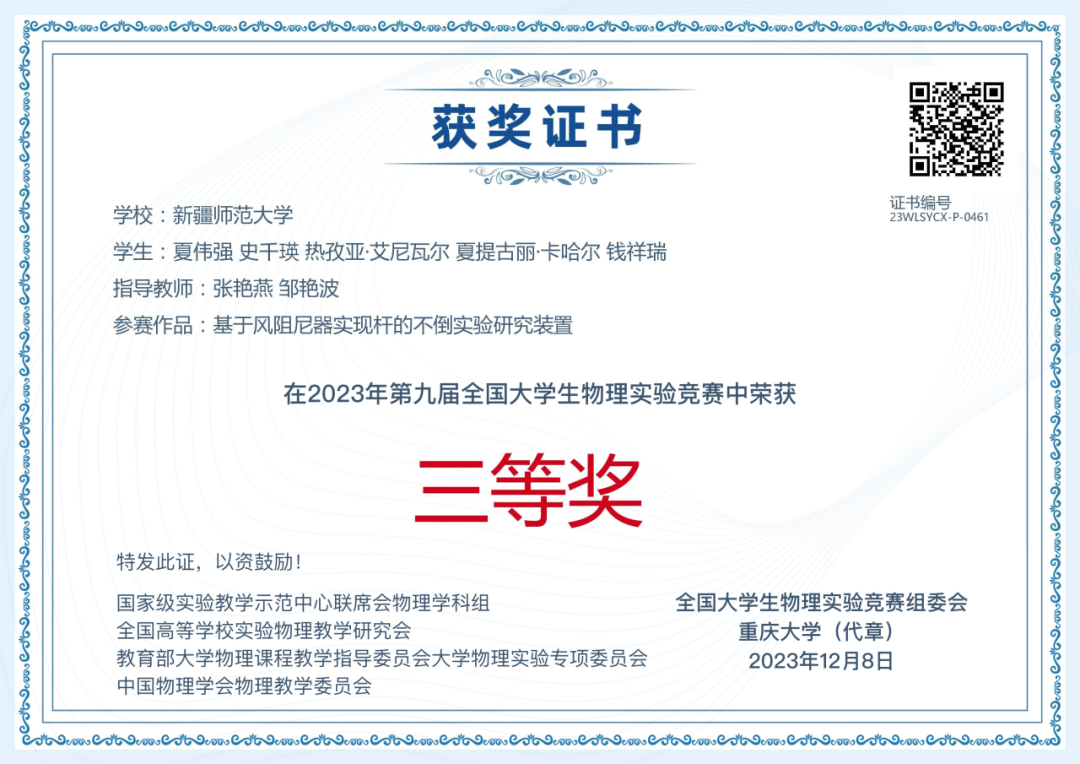 11月25日,第九届全国大学生物理实验竞赛(创新)决赛在重庆大学举行,本届比赛共吸引全国603所高校、2340支队伍、13000余人报名参赛。最终,231所高校的427支队伍1200余名选手进入决赛,参赛学生人数创下历届新高。竞赛由国家级实验教学示范中心联席会物理学科组、全国高等学校实验物理教学研究会、教育部大学物理课程教学指导委员会大学物理实验专项委员会、中国物理学会物理教学委员会主办,重庆大学承办,《物理实验》杂志协办。赛事影响力大,参赛规模高。经历复赛、决赛,经过900余位评审专家对2251项参赛作品的评审,最终评出“命题类创新作品”“自选课题类创新作品”和“大学生物理实验讲课比赛”3个类别的一等奖、二等奖、三等奖和优秀奖,332所高校获优秀组织奖。william威廉中文官网选派的5支代表队喜获佳绩,荣获命题类二等奖1项、三等奖1项,自选类三等奖1项、优秀奖1项,讲课类优秀奖1项。WilliamHill中文官方网站获优秀组织奖。