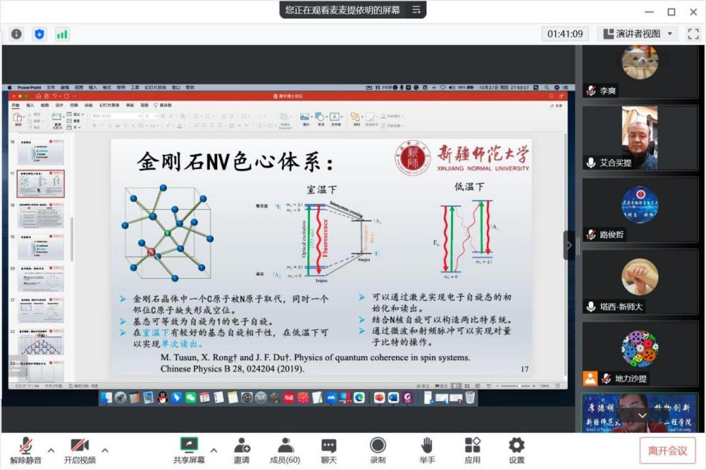 麦麦提依明·吐孙老师以“基于固态自旋体系的量子行走研究”为主题,阐述了基于金刚石NV色心这一量子计算的重要候选体系,实验上实现在圆上的连续时间量子行走,验证金刚石NV色心可编程处理器的计算灵活性,这有助于多粒子量子行走以及在大规模室温可编程量子计算框架中实现各种量子算法的研究。在交流阶段,对理论的研究、模拟计算、实验设备等方面的提问进行了解答。