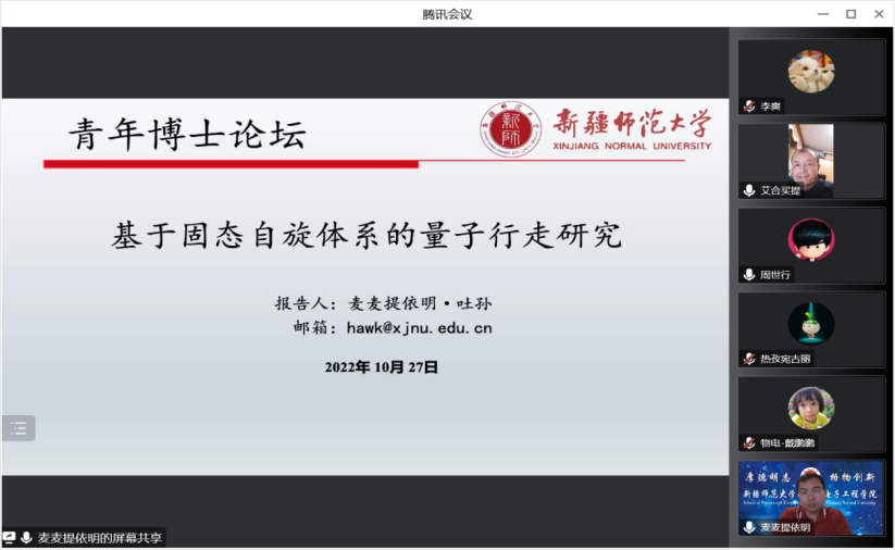 2022年10月27日下午20:30,william威廉中文官网第二届学术月系列活动—青年博士之“量子科学”论坛在线上举行。会议由赴对口支援学校中国科学技术大学攻读博士的在职教师周世行和麦麦提依明·吐孙分享研究成果。艾合买提·阿不力孜教授主持会议,我院共67名教师、研究生参会。