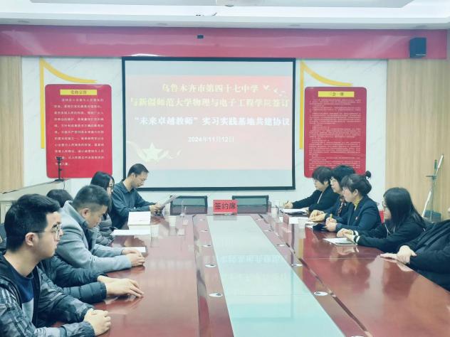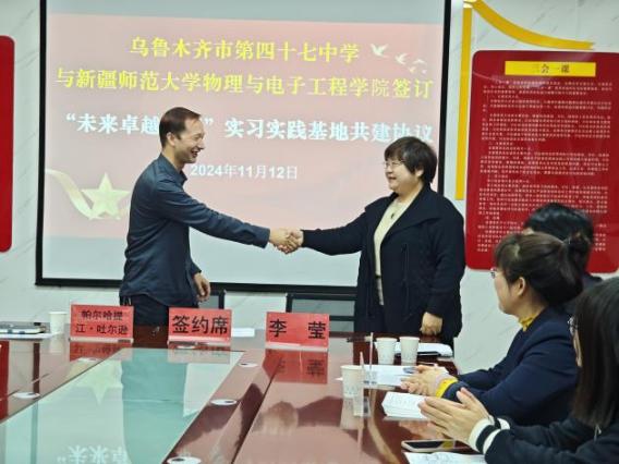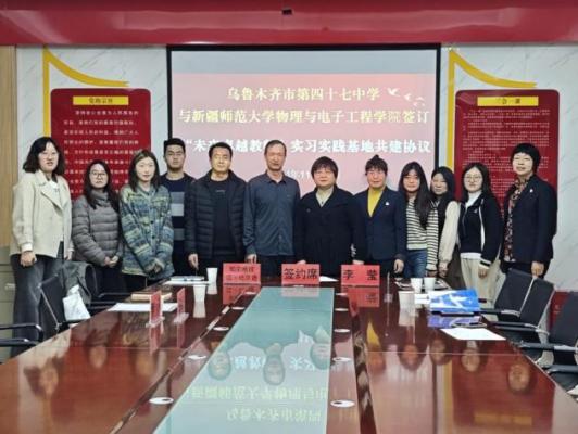 为进一步提升学生实践能力,深化教育改革,提高人才培养质量,促进产学研合作。11月12日,william威廉中文官网副院长帕尔哈提江·吐尔孙、物理系教研室主任王晓宁一行赴乌鲁木齐市第四十七中学和第九十中学进行“未来卓越教师”实习实践基地签约仪式。第四十七中学副校长李莹、教研室主任孙宇辰、教研室副主任刘文倩及全体教研室教师,第九十中学学校党支部书记祁海宾、副校长张松和副校长马荣参加了签约仪式。
